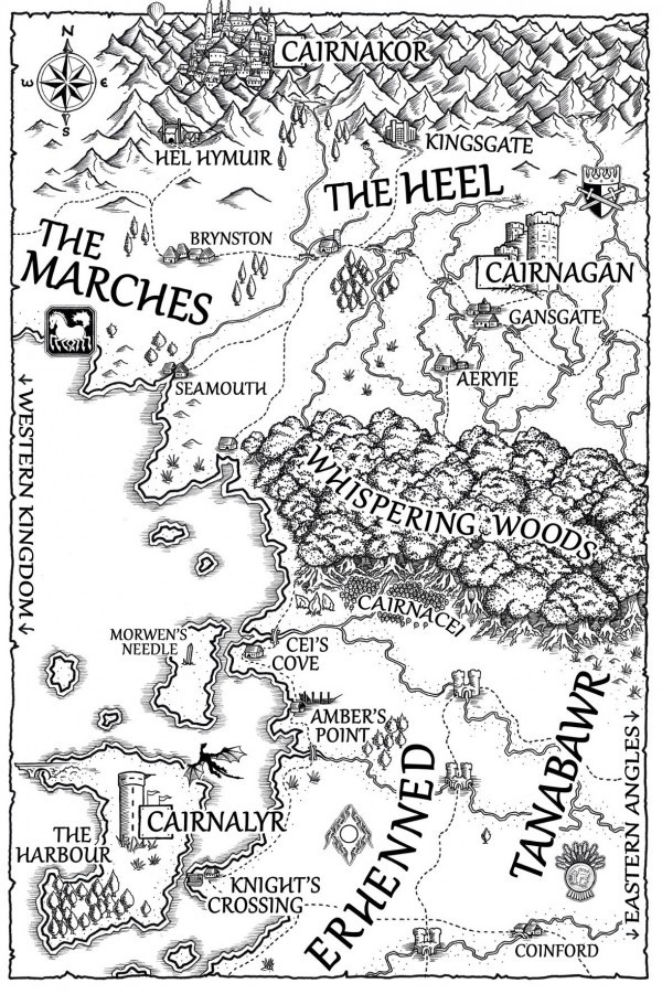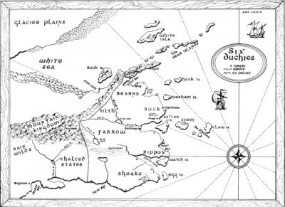 What I love most about this map is that it’s not necessary at all. Hobb did a marvellous job in her Farseer Trilogy of drawing a map in the mind of the reader with words. I never referred to this map out of necessity, which made it something to look at purely for the joy of it. And whilst some called it a lazy map, I quite like how sparse it is. A lack of detail is an open door to the imagination, and this is a map that allows the reader to paint huge vistas onto it.