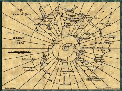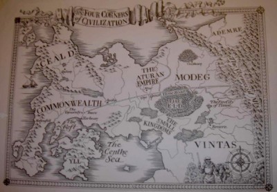 The map from Patrick Rothfuss’ debut novel, The Name of the Wind gets a slot on this list purely for the illustrative decoration to it. Very often fantasy maps can be functional things, something to tell readers that there’s a city here, a mountain over there, and the Valley of Eternal Doom is to the south. But look at the name of the map, written over a indulgent ribbon, or the illustration of a man in the corner. Maps don’t always have to be functional. They can be artistic too.